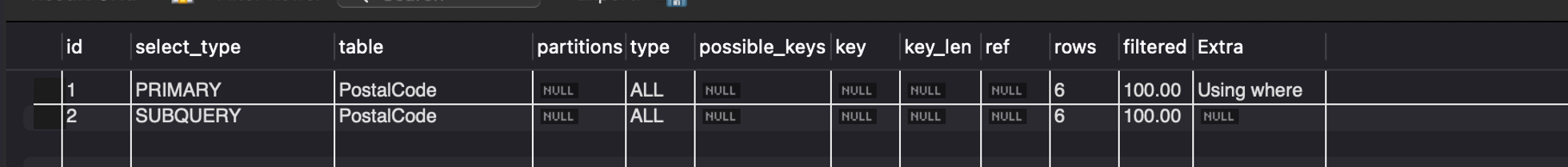 서브쿼리로 인해 풀스캔이 2번 발생한다. 현재는 레코드 수가 몇개 안되어서 괜찮지만, 테이블 수가 수천만으로 늘어나면 시간이 꽤 걸릴 것이다. 따라서 스캔 횟수를 줄여야 한다.