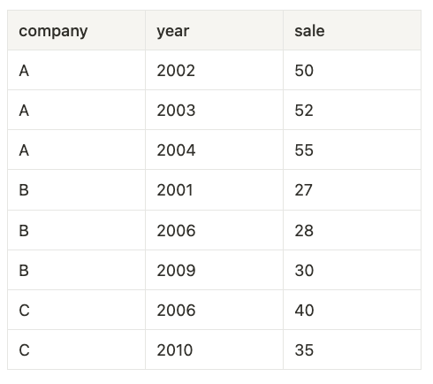 SELECT company,year,sale,