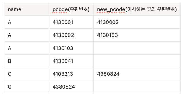 - 제일 최근에 이사한 주소(new_pcode = NULL)에서 거꾸로 예전 주소를 검색해 나간다.
