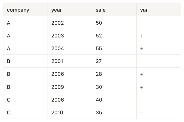 CASE SIGN(sale-MAX(sale) OVER(PARTITION BY company ORDER BY year ROWS BETWEEN 1 PRECEDING AND 1 PRECEDING))