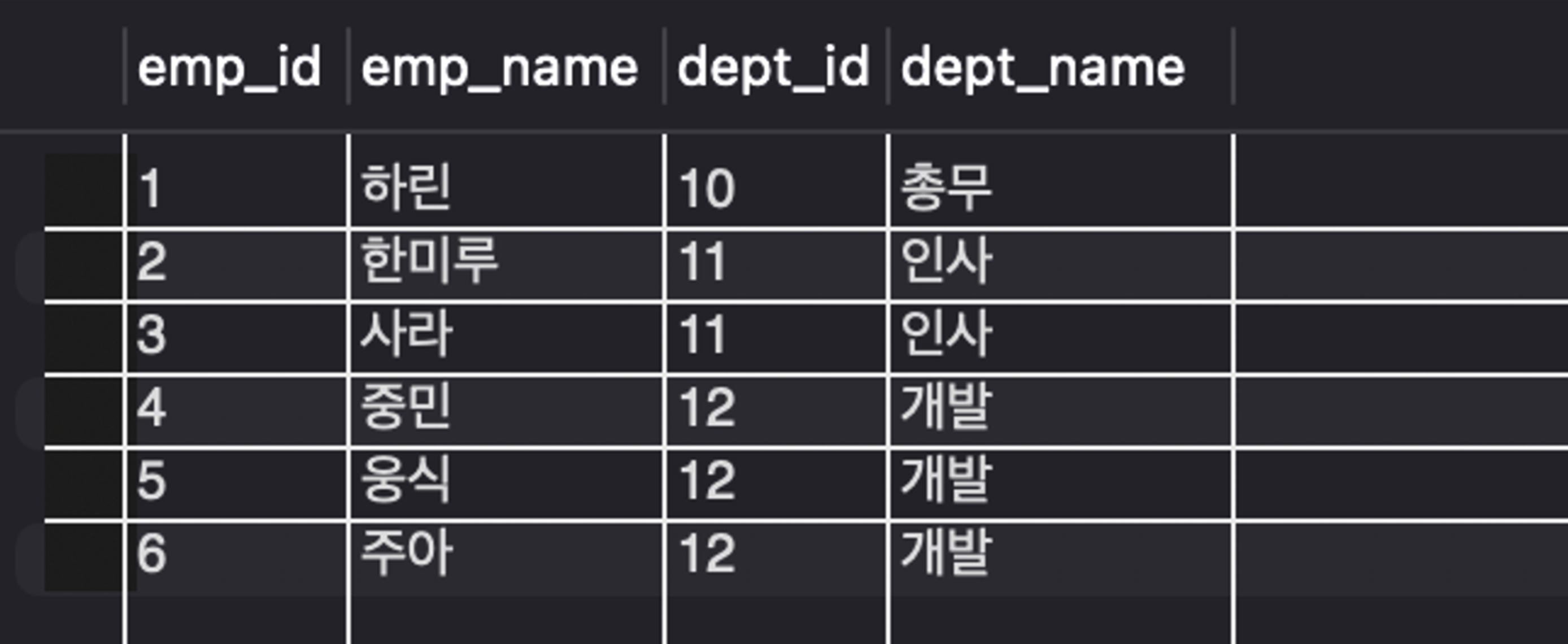 - 위의 결과와 같이 오른쪽 테이블인 Department 테이블을 기준으로 한다.