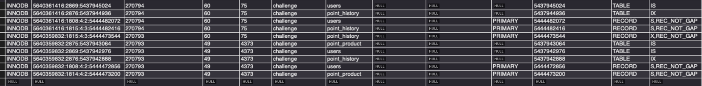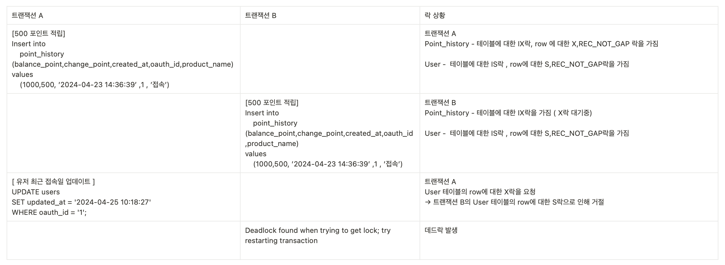 (User의 PK인 oauth_id가 point_history 테이블의 복합키로 구성되어 있어, 참조 무결성 조건 때문에 User 테이블의 S락을 갖고 있음)