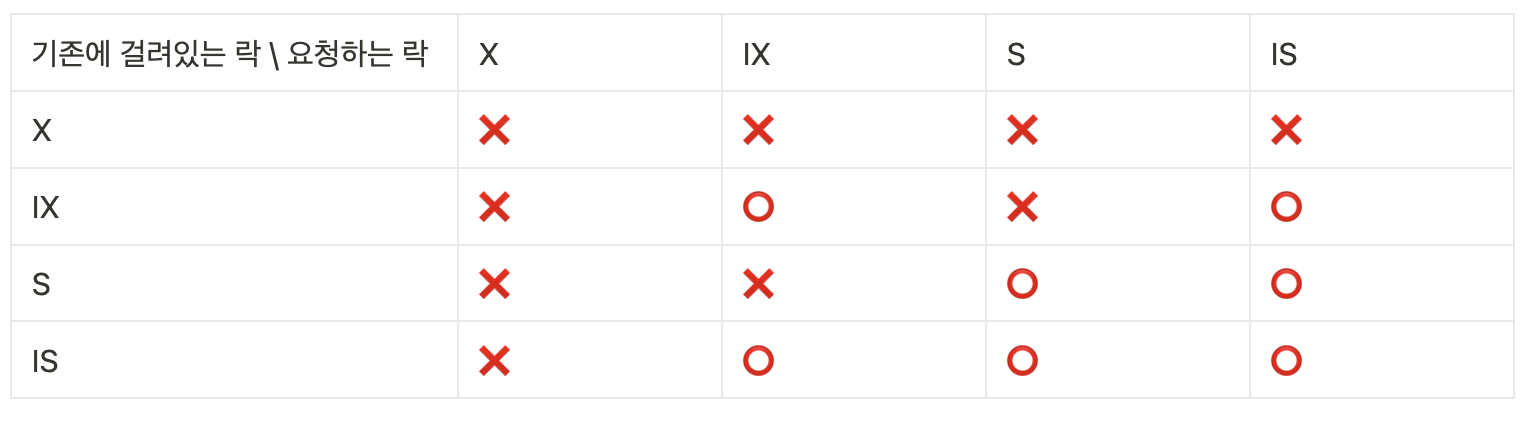 기존에 S락 또는 X락을 갖는 트랜잭션이 존재할 경우, 다른 트랜잭션은 X락을 갖지 못한다.
