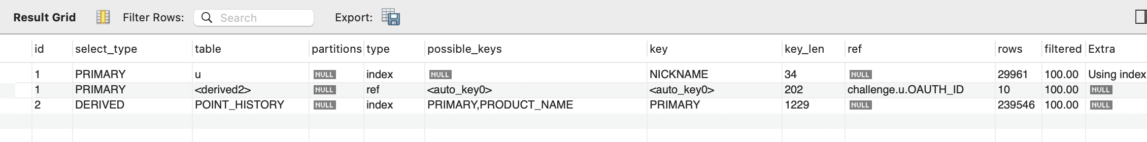 Point_history 테이블은 ref 타입으로 탐색되는데 , ref는 조인의 순서와 인덱스의 종류에 관계없이 동등 조건으로 검색한다.