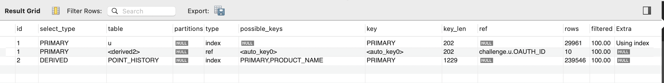 rows 값은 'MySQL 옵티마이저가 각 테이블 또는 조인 조건에 대해 읽을 것으로 예상하는 행의 수'를 의미하는데 , 내가 point_history 테이블 더미데이터를 한 유저당 8개 정도의 데이터를 갖게끔 구성했기 때문이다... 똑똑한...Mysql...큼...