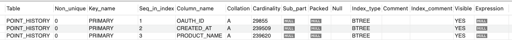 분명, Point_history 테이블의 PrimaryKey는 복합키로, (oauth_id,created_at,product_name) 3개의 컬럼이 복합된 키이다.