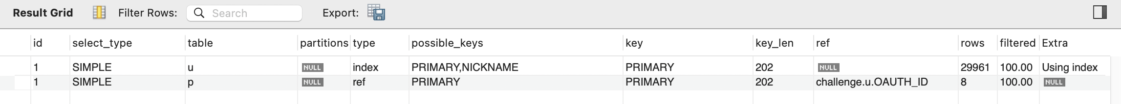 실행계획을 확인해 보니, User 테이블에서 인덱스가 oauth_id가 아닌 Nickname으로 타서, Hint를 사용했다.
