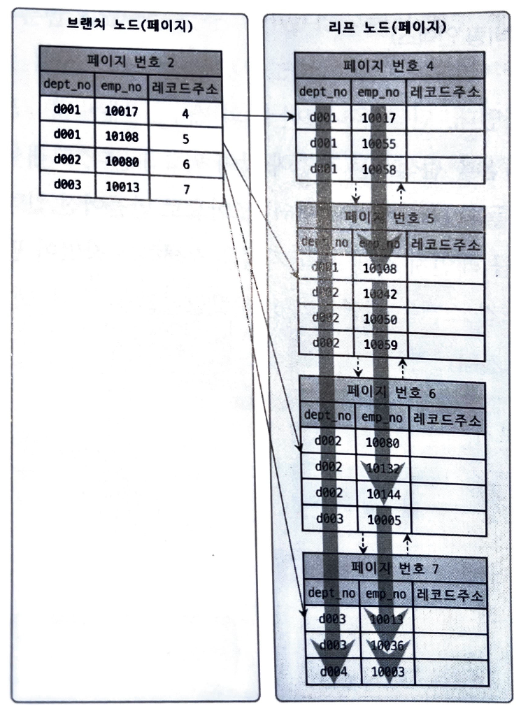 아래 다중 칼럼 인덱스를 예시로 들어보면 , dept_no를 기준으로 정렬하고, dept_no 순서에 의존하여 emp_no 칼럼이 정렬되고 있는 것을 확인할 수 있다.