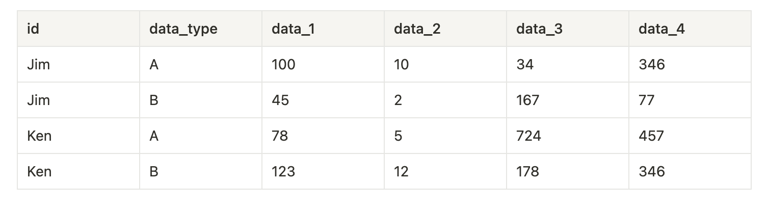 data_type 별로 필요한 데이터 값을 구해야 한다. 이때 data_type이 A일때는 data_1과 data_2 값만 필요하며, B일때는 data_3과 data_4 값만이 필요하다